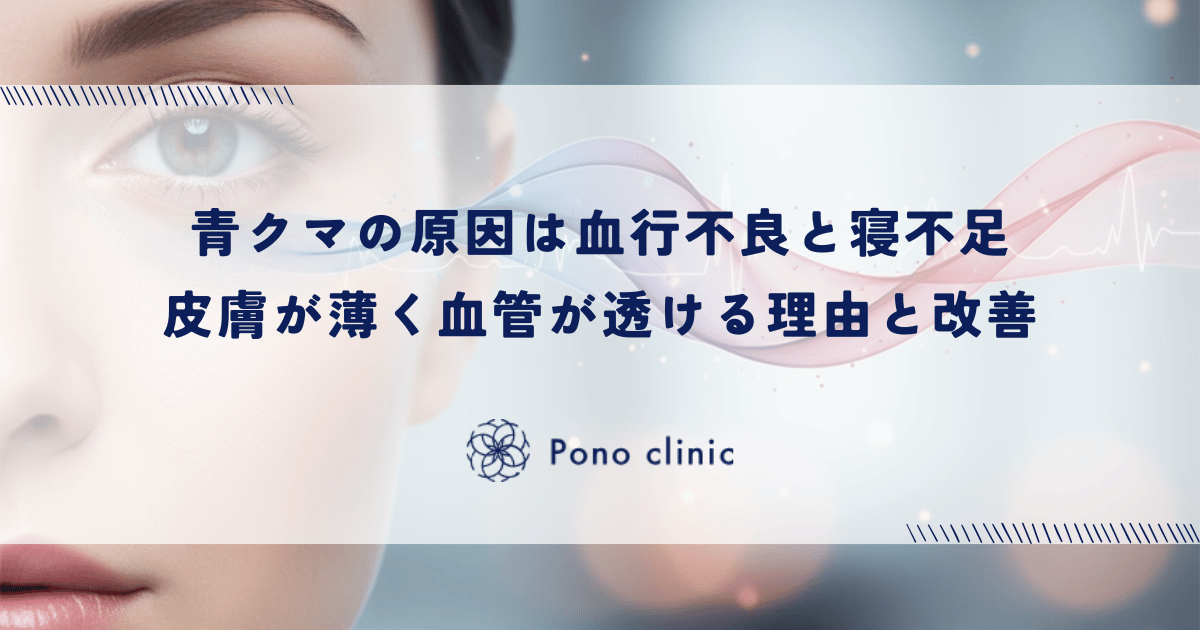 目の下が青黒く見える「青クマ」の正体は、滞った静脈血が目元の薄い皮膚を通して透けて見えている状態です。主な原因は血行不良や寝不足、そして生まれつきの皮膚の薄さにあります。